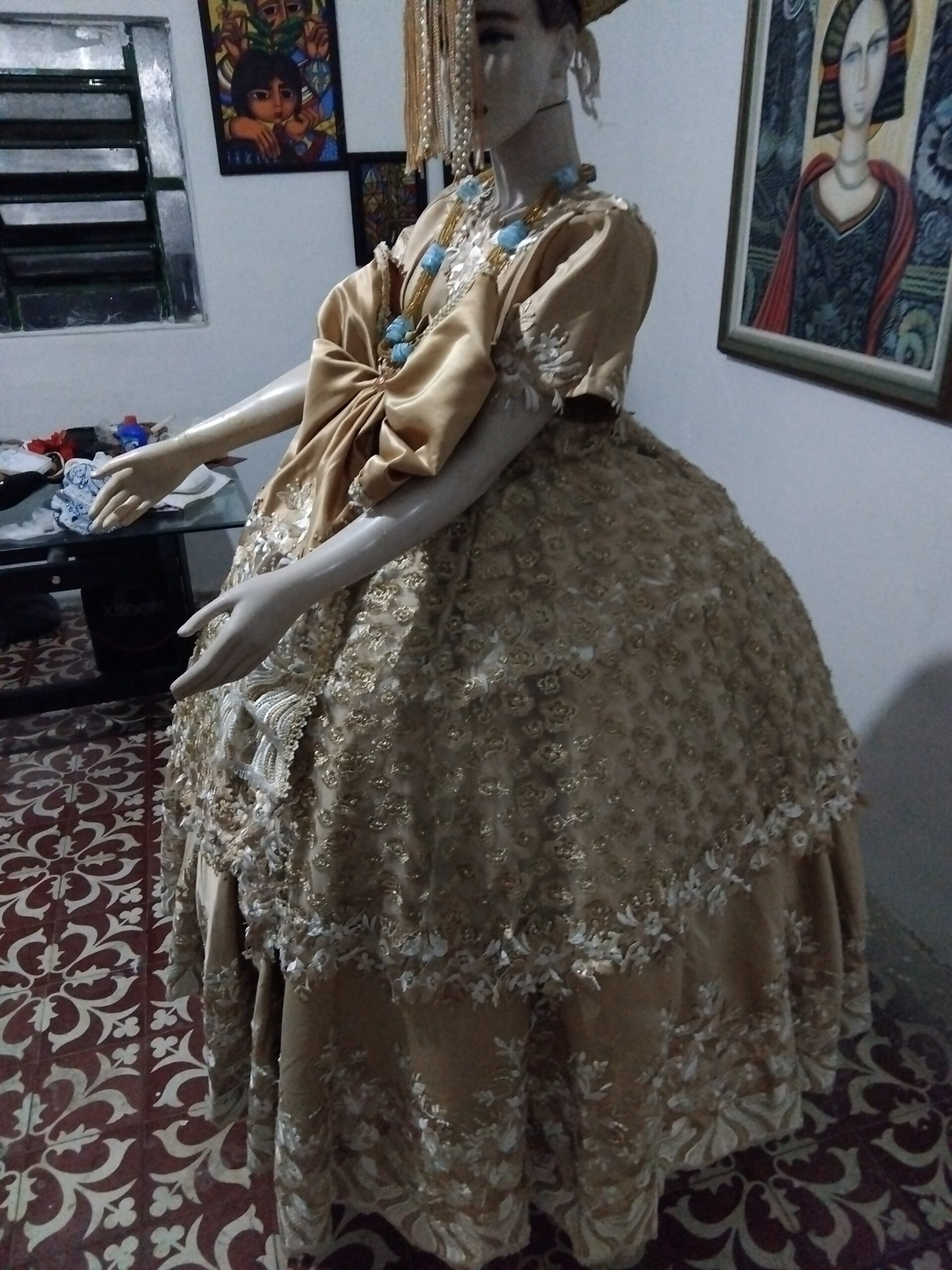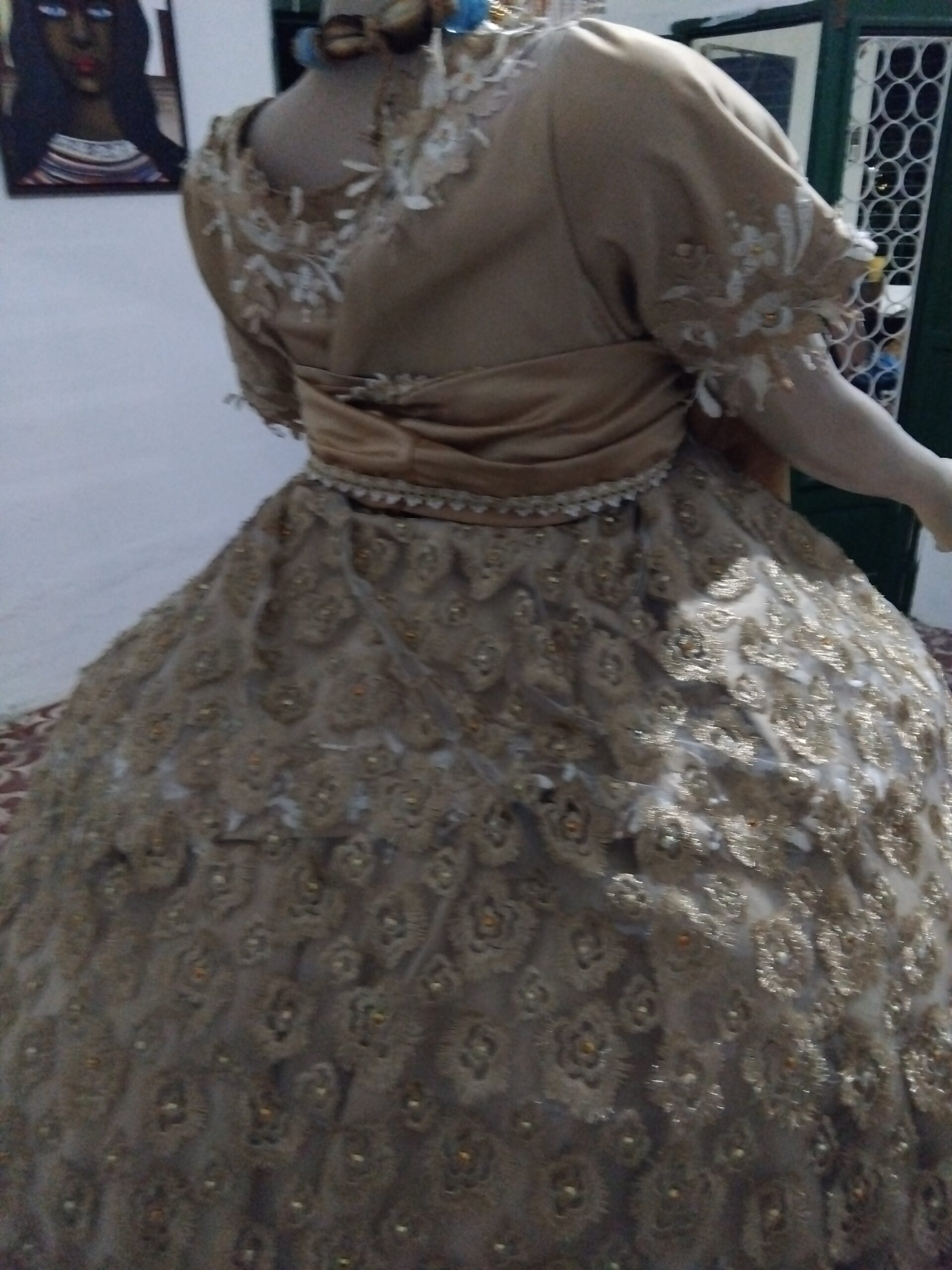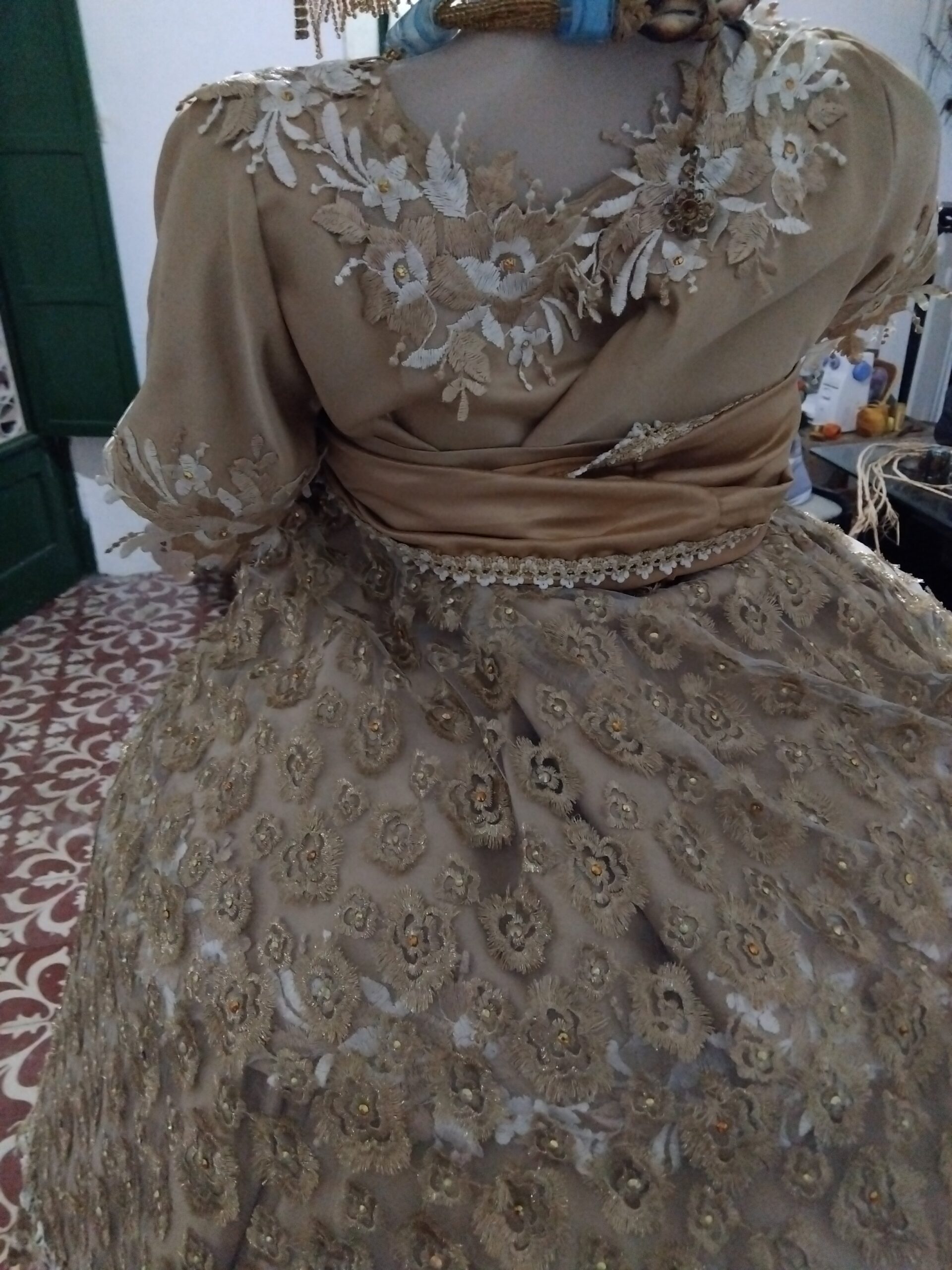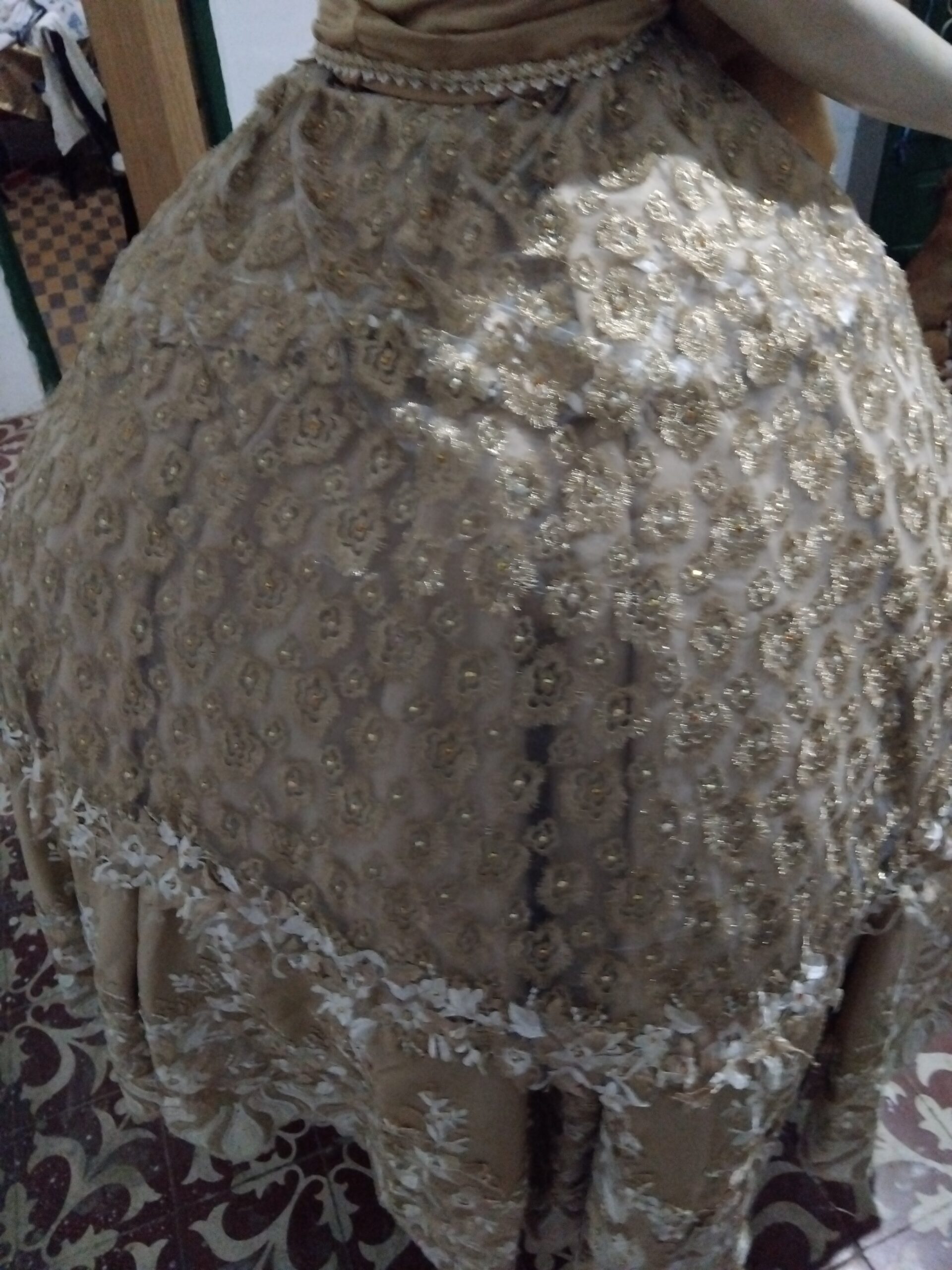 Saia com 12,00m de roda em tafetá bordada e pedrarias;